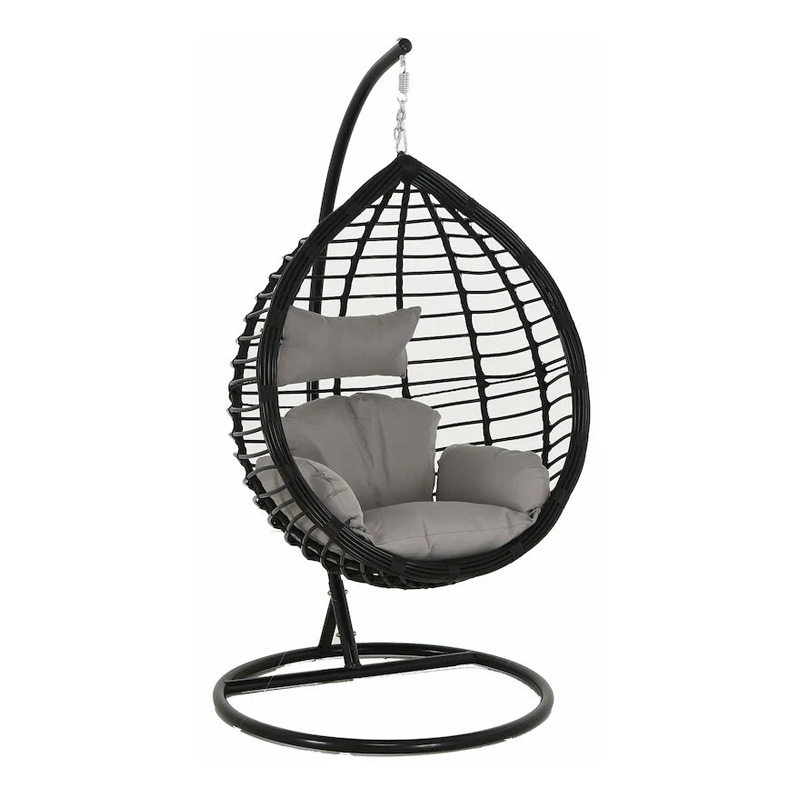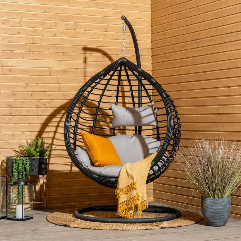 Musta String riipputuoli on tyylikäs valinta terassille. Riipputuolin kestävä teräksinen teline voidaan sijoittaa kätevästi haluttuun paikkaan. Istuinkorkeus säädettävissä kiinnitysketjun avulla. Mukana tulee pehmusteet, jotka on verhoiltu vettähylkivällä ja kulutusta kestävällä kankaalla.